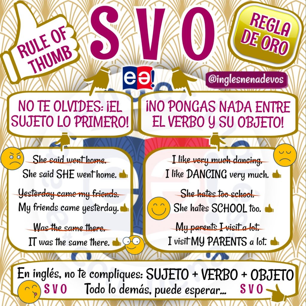 Of course, a esta estructura básica le podemos añadir más cosas y construir frases más complejas, pero este orden: sujeto + verbo + objeto es la base y las frases seguirán esta estructura en el 98% de los casos. Así que es necesario tener esto muy claro y repetirlo una y otra vez, porque te ayudará a pensar en inglés siguiendo sus estructuras y, de este modo, dejar de traducir; o por lo menos hacerlo menos…